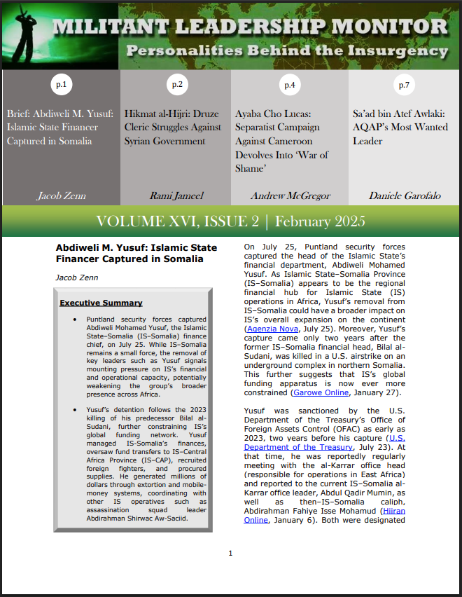The February 2025 issue of Militant Leadership Monitor starts off with a look at Abdiweli M. Yusuf, Islamic State–Somalia finance chief. Following the brief, there is an examination of Hikmat al-Hijri, the Druze cleric who consolidated Druze resistance and positioned himself as the main obstacle to new president Ahmed al-Sharaa’s authority in southern Syria. In the next article, the publication considers Ayaba Cho Lucas, the imprisoned head of the Ambazonia Governing Council, an anglophone separatist group in Cameroon. The publication ends with an account of Sa’ad bin Atef al-Awlaki, the new head of al-Qaeda in the Arabian Peninsula.